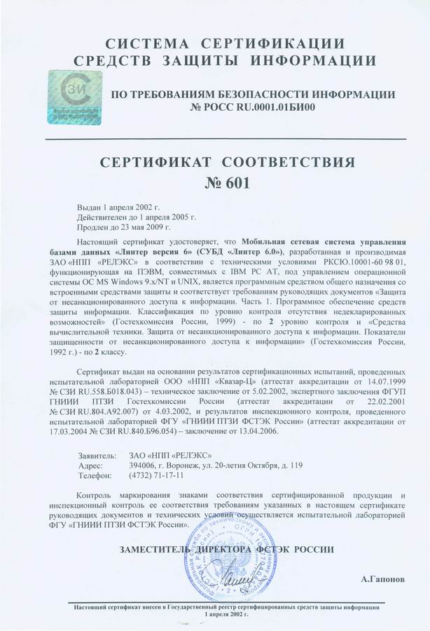 Certificate № 601 of April 1, 2002 by the Federal Certification Committee certifying Linter 6 as compliant with the Class 2 data security requirements has been extended.